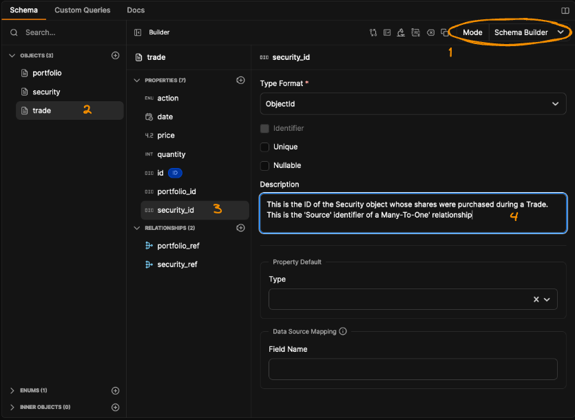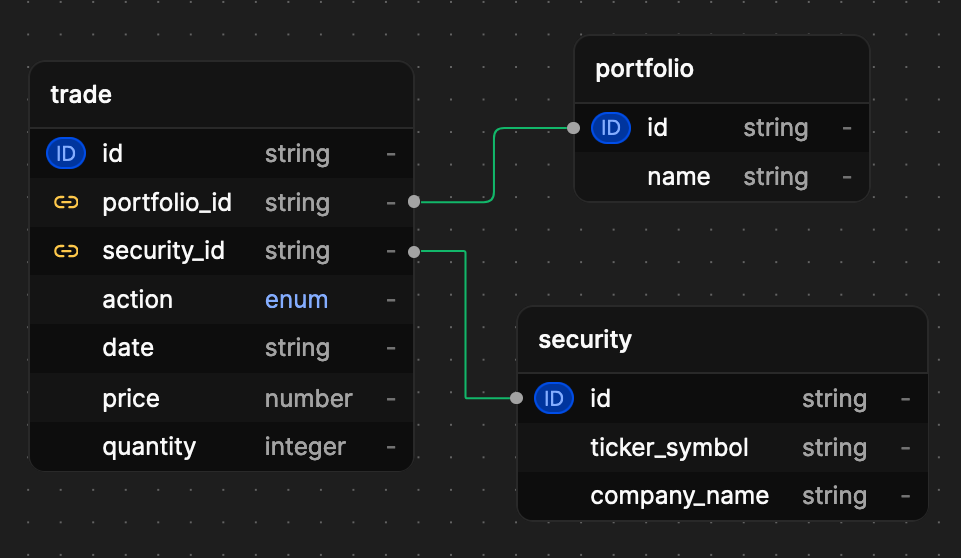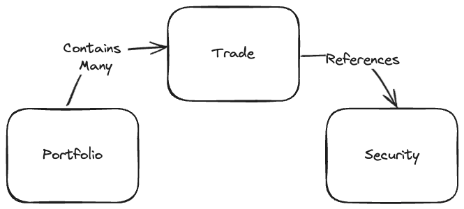 In our application, we have Security, Trade, and a Portfolio objects, each of which have their own set of properties belonging to themselves as well as relationships between each other.