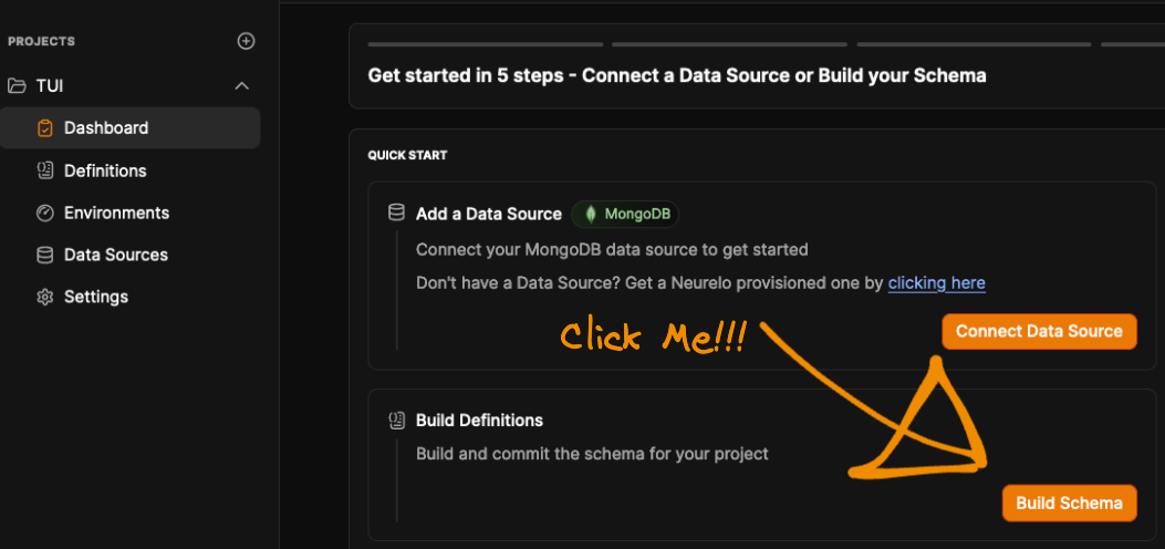In the Quick Start Guide, you have two tasks. I’d like you to start the second one by pressing the **Build Schema** button