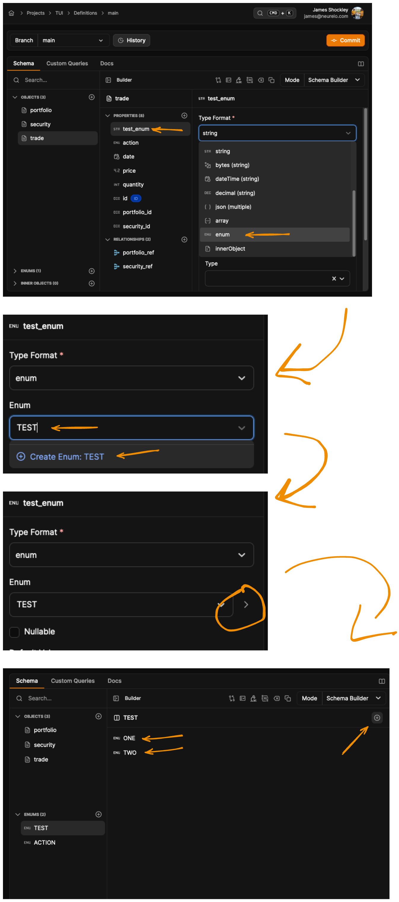 **Enums** in Neurelo are defined at a **Schema** scope, but instanced & created as a **Property** of an **Object**. Meaning, you can share an **Enum** between multiple **Objects**!