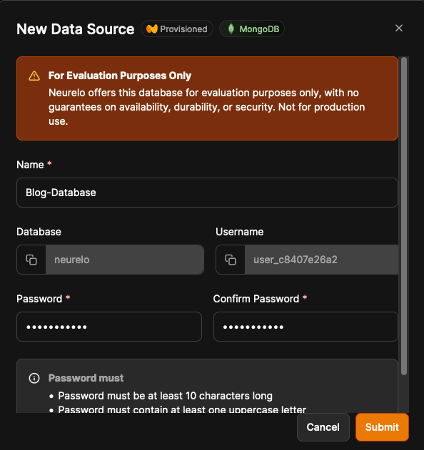 The most important option to consider when completing the **Create Project** modal is ensuring you are picking the correct **Database Engine** for your project. Neurelo supports many backend databases - Postgres, MySql and MongoDB, and most concepts are interchangeable, *but* with MongoDB we can also instantly provision an evaluation database on MongoDB Atlas without leaving Neurelo!