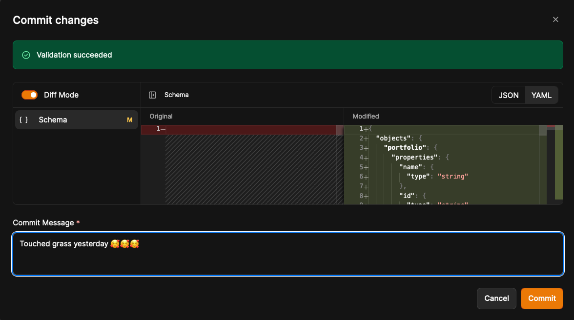The **Schema** diff will be visualized for you and you’ll be asked to include a brief commit message. If this workflow feels familiar to you as a developer because you use Git, then great! You may also be interested to know that Neurelo allows you to manage your schema as code entirely within your own git repository as well- I’ll include a link to documentation on this feature at the end!