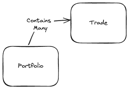 Let’s start first with a Portfolio - a Portfolio is a container entity and is ultimately an origin for a transaction, since a user (not pictured) will need a Portfolio to associate a Trade to.