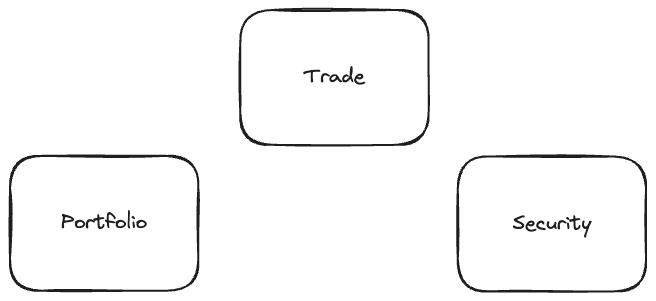 The Trade itself is an intermediate entity, Trades contain a reference to a Portfolio, as well as something that is intended to be traded. That third entity, just described, is called a Security.