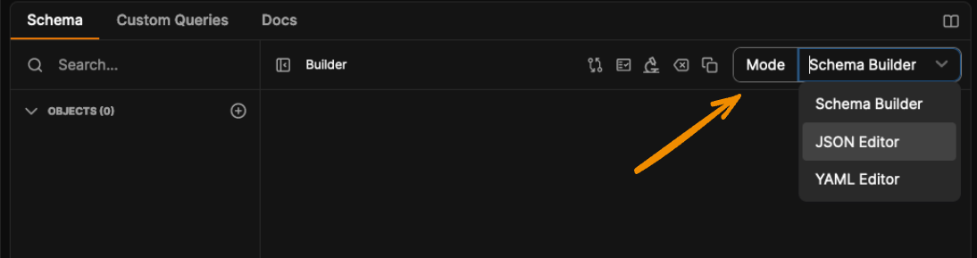 Next, using the **Mode** selector in the top right we’ll switch back from **JSON Editor** mode to **Schema Builder**, inverting the action we took at the start.
